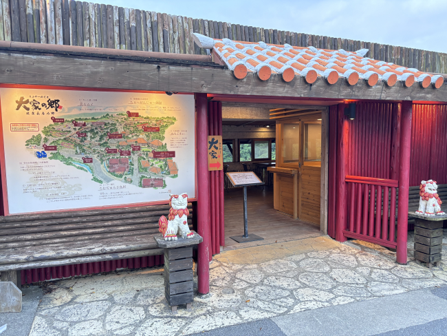 鮮紅的木柱、傳統的赤瓦屋頂,再加上入口兩側的沖繩獅(シーサー)
