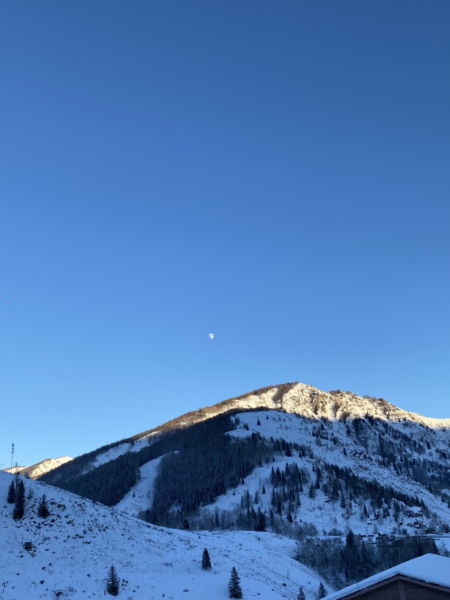 正如圖片所示,清澈湛藍的天空中,一輪明月或弦月高掛,為白日雪景增添了幾分神秘與寧靜