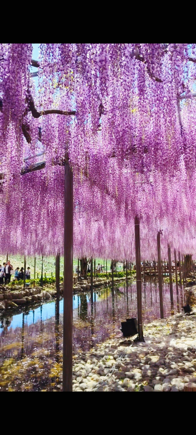 紫色的花穗從棚架如輕紗般傾瀉而下,倒映在水面上,形成一幅上下對稱的天然畫作。