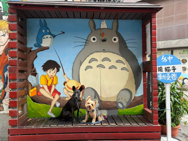 這次帶著我的兩隻毛孩來到「台中龍貓亭動漫巷」,彷彿走進了吉卜力的動畫世界。背景是一幅生動的《龍貓》彩繪牆,龍貓安靜地坐在中央,旁邊還有熟悉的角色們,色彩鮮明又充滿童趣。兩隻狗狗坐在前方木製小亭裡,一黑一棕的身影與背景形成有趣的對比,牠們似乎也感受到這份可愛氛圍,乖巧地看著鏡頭,像是在說:「我們也是這故事的一部分!」這裡不僅是動漫迷的打卡天堂,更是帶寵物散步時的驚喜發現。站在這個場景中,我彷彿回到小時候單純的快樂,感受到現實與幻想交織的美好。這趟旅程雖然只是短暫的停留,卻讓人收穫滿滿笑容與溫暖回憶。