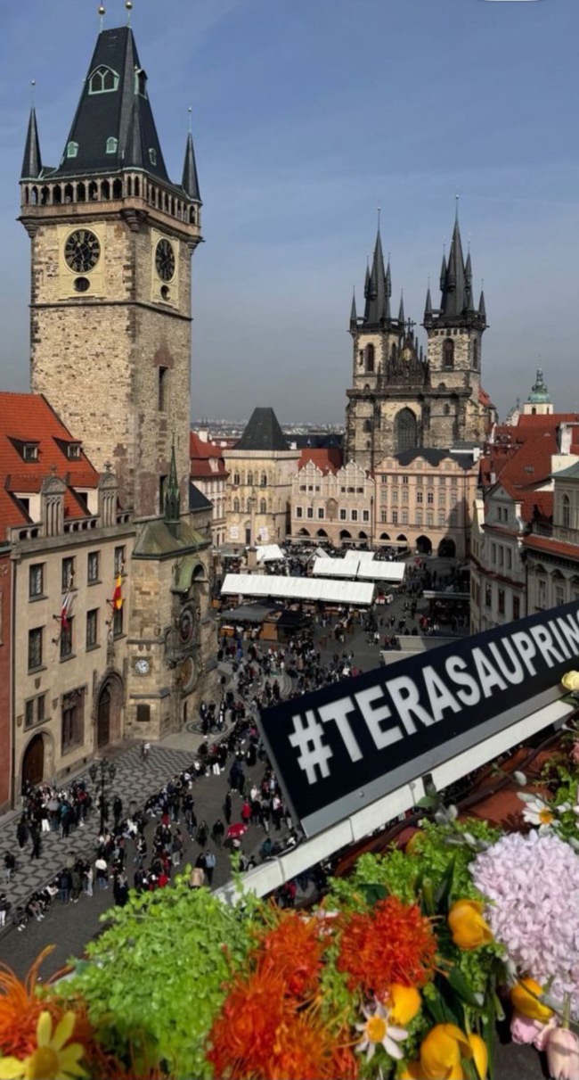 這張照片拍攝的是捷克布拉格舊城廣場(Old Town Square, Staroměstské náměstí),是布拉格最著名、最具代表性的景點之一。 左邊高塔是舊市政廳塔樓,牆面上可以看到世界知名的布拉格天文鐘(Prague Astronomical Clock, Orloj),自1410年起運作至今,是全球最古老仍在使用的天文鐘之一。每逢整點,木偶人偶會出來報時,吸引大批遊客駐足觀賞。 右方尖塔建築是提恩教堂(Church of Our Lady before Týn),屬於哥德式建築代表,以雙塔聞名,彷彿守護著整個廣場。 舊城廣場融合了哥德式、巴洛克式與文藝復興風格的建築,廣場上常有市集、慶典與表演,是布拉格的文化與歷史核心。從高處餐廳或露台(例如照片中的「#TERASAU PRINCE」)俯瞰廣場,更能感受這座中世紀城市的浪漫氛圍。 ✨特色總結: • 世界最古老的天文鐘 • 哥德式雙塔提恩教堂 • 中世紀廣場與多元建築風格 • 熱鬧的市集與慶典氛圍