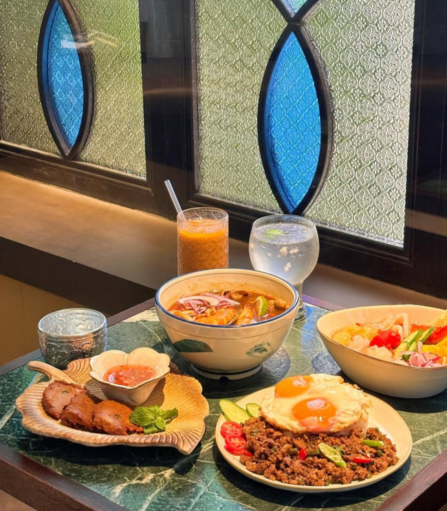 高雄南洋小餐館 介紹新崛江附近的南洋小餐館,舊式建築外觀十分有特色及亮眼,很特別的是一樓主打午餐/晚餐南洋料理,二樓8點後是復古酒吧,店內裝潢充滿復古氣息很有記憶點,餐點整體下來推叻沙/酸辣系列! 泰式酸辣麵$180 MVP 很喜歡!湯頭濃郁香氣撲鼻,酸辣感很過癮,加檸檬整個解膩又清爽,主食搭配炸意麵吸附湯汁但軟硬適中不軟爛(沒有討厭的火鍋料,有兩尾鮮蝦、豆腐、小卷、魚丸、蟹腿、高麗菜) 二双黃打拋豬肉飯$170 呼應店名所以有兩顆迷人的半熟蛋! 打拋豬辣度不高是人人可接受範圍,豬肉口感紮實,醬收的很乾但搭配半熟蛋的滋潤口感就好很多,整體中規中矩,香氣中帶有九層塔香! 二泰式涼拌海鮮沙拉 $140 用料豐富有鳳梨、黃瓜、小番茄、小卷及蝦子,以為沒有了結果下面撲滿生菜絲,泰式醬配上海鮮及生菜,一口吃冰冰涼涼真的很消暑,海鮮稍可惜(沒海鮮食材本身的味道及口感。 双黃招牌泰式魚餅$90 魚餅味道蠻特別的吃不太懂,就是我跟友人都覺得不合胃口,整份三塊但我們沒有吃完6 二招牌濃泰奶$80 來這邊當然少不了泰奶!泰式奶茶不死甜很喜歡,喝起來口感醇厚,煉乳香氣很足夠又不膩口 100%椰子水$70 解膩透心涼第一名!吃了打拋豬跟酸辣麵到後面一定覺得鹹又渴,這時候喝一口椰子水,讓人瞬間活過來!