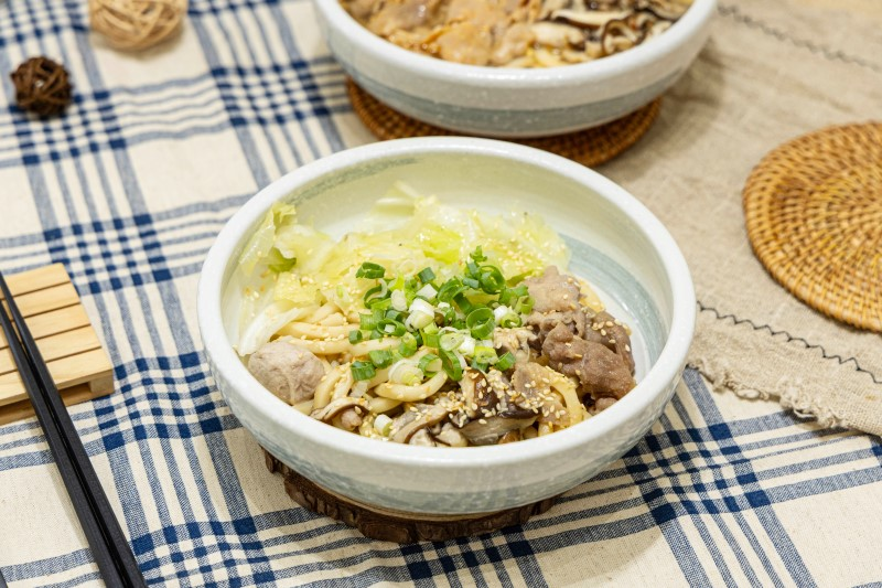 配料上加入鮮嫩的豬肉片、香菇與清甜高麗菜,撒上蔥花與芝麻,為整碗麵增添爽口與香氣。