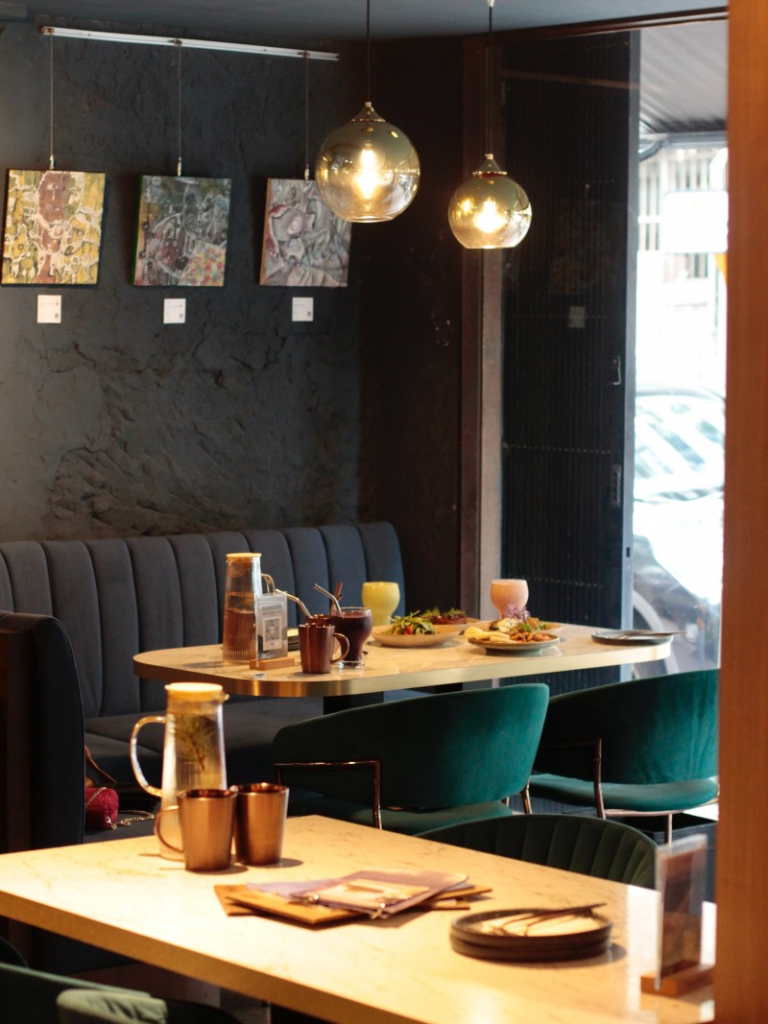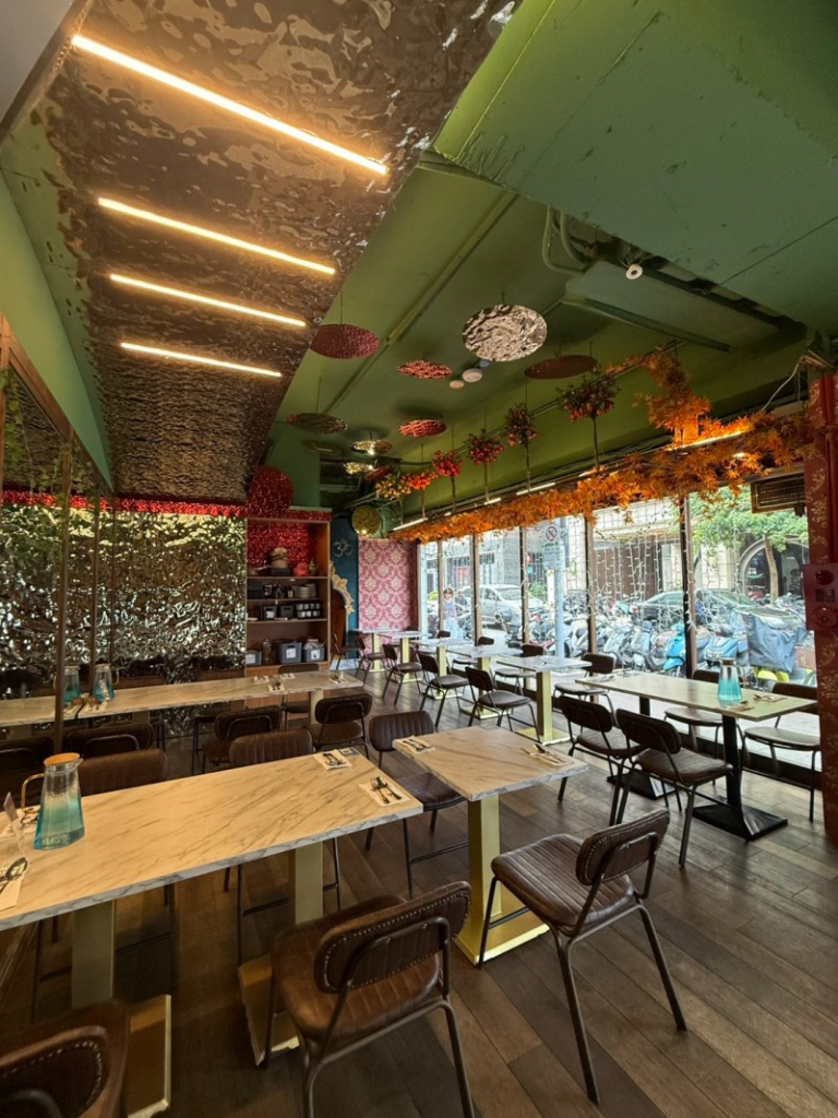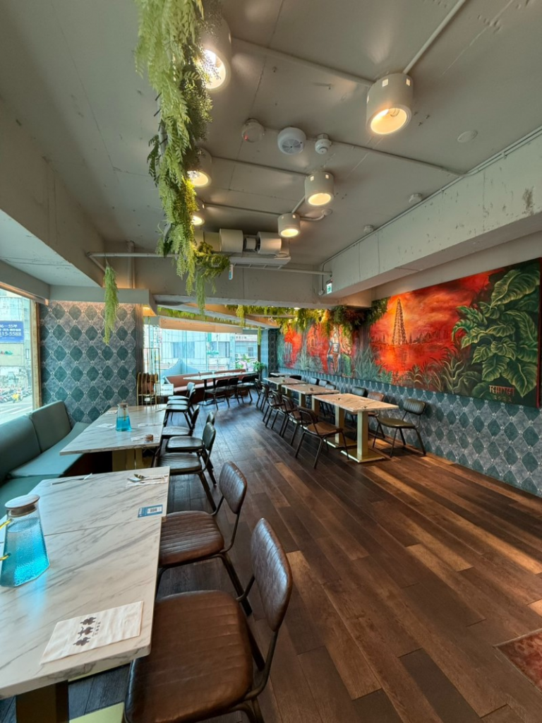 內部空間以木質地板搭配大理石桌面,簡單卻不失雅緻,天花板垂掛著綠植與花卉點綴,搭配色彩鮮明的壁畫,讓空間多了一份異國的活力與溫馨感。