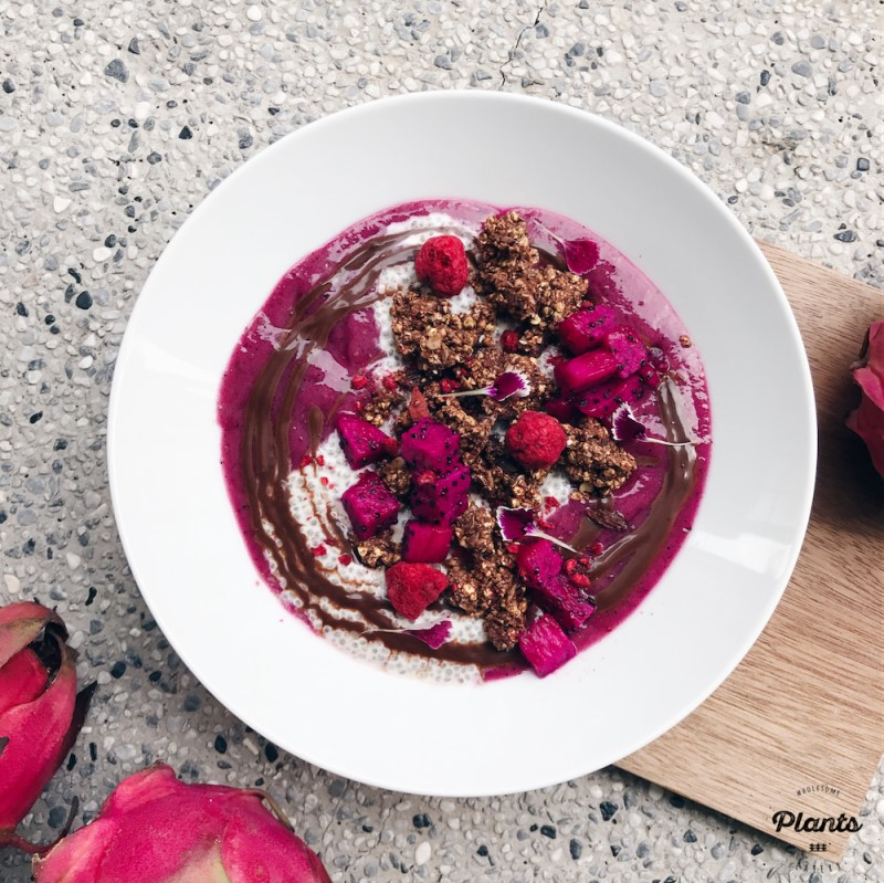 奇亞籽布丁增加了口感層次,搭配時令水果、榖片與巧克力醬,甜而不膩,每一口都幸福感滿滿。