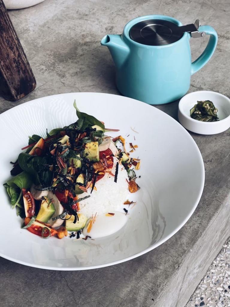 以米飯為基底,上面鋪滿寶貝生菜、黑美人菇、小樹糖醋醬、醬拌秋葵等配菜,食材豐富且清爽。