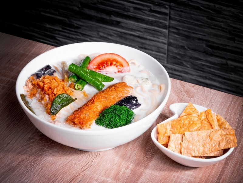 充滿椰香又帶有層次感的湯頭,與滑嫩麵條相得益彰。搭配素花枝捲、酥脆豆皮,吸滿湯汁後口感更加豐富。