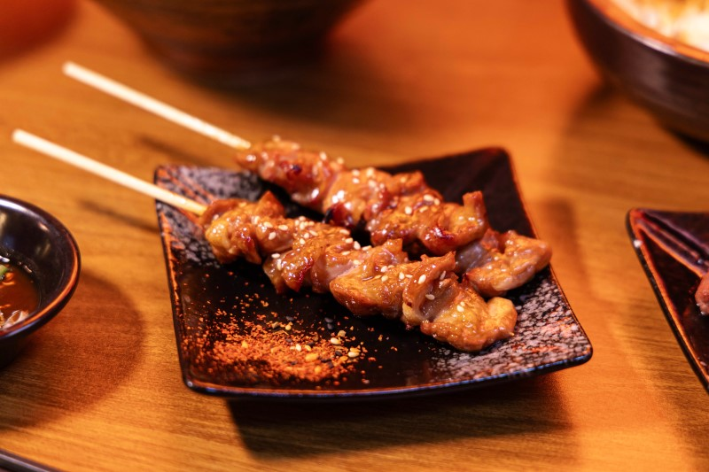 雞松坂帶著獨有的彈脆口感,經炭火慢烤後油脂逼出,外層焦香、內裡仍保有嫩度。刷上特調醬汁,鹹甜交織的風味在齒間蔓延,最後撒上白芝麻點綴,增添一抹香氣。一旁附上的七味粉,讓你能依喜好添入辛香層次,無論單吃或佐酒,都能感受到這份細膩而過癮的滋味。