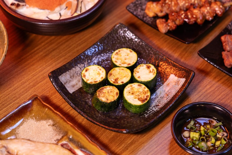 這道鹽烤櫛瓜選用新鮮厚切櫛瓜,經過炭火輕烤後表面微微焦香,內裡仍保有多汁清甜。