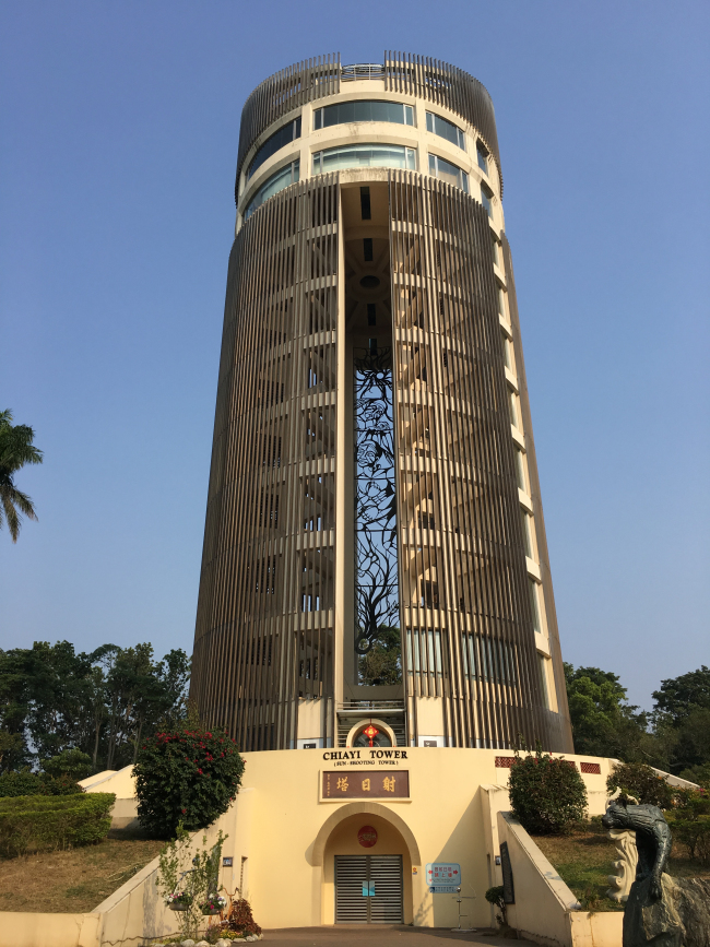 射日塔 這是位於嘉義公園東郊的高地上,起初是嘉義神社,後來改為嘉義忠烈祠,但是經過大火燒毀後,又改建為射日塔,所以這個地標含有繼往開來的傳承精神,具有社教意義。建築造型構想是來自於阿里山神木,塔身褐色的鋁條所形成的紋理與神木的外皮相似,外型上具備相當的現代感,塔頂斜面鑲嵌著嘉義市的市花—豔紫荊,象徵著嘉義市的熱情,並已經成為嘉義市重要的觀光地標之一。